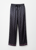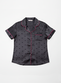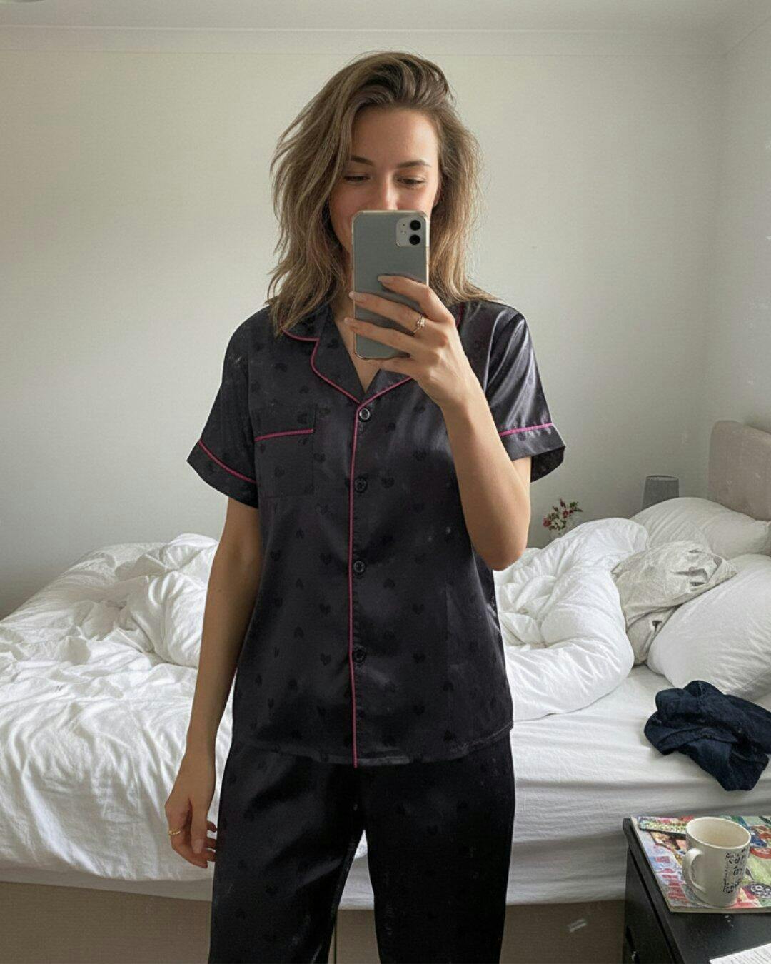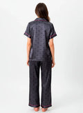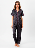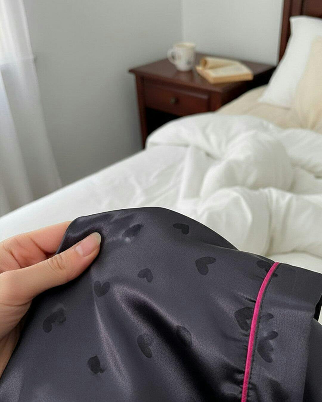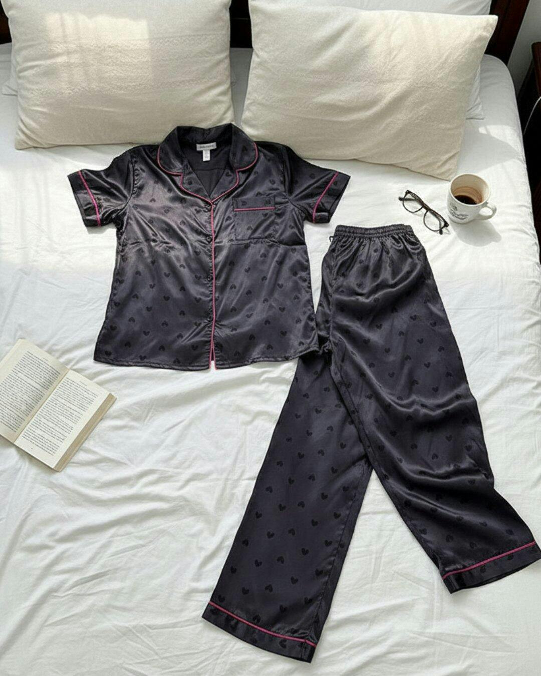 Refresh your nightwear with this Black Satin Heart Pyjama Set with Pink Trim from Zzzoria. Crafted from a silky-soft blend of 95% polyester and 5% elastane, it feels smooth against the skin and offers lightweight comfort for summer nights. The short-sleeved button-up top with a neat lapel collar pairs beautifully with full-length trousers, both adorned with a charming floral print. Perfect for lounging, sleeping, or even a cosy pyjama party, this two-piece set combines everyday comfort with feminine elegance.