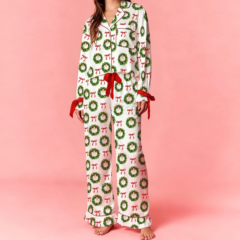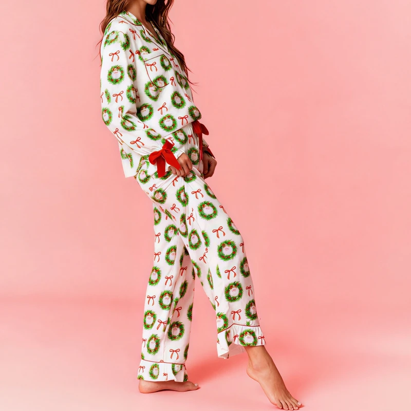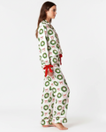 Crafted from soft, breathable polyester with a smooth lightweight feel, this full-length set is designed to keep you snug without overheating. The turn-down collar and full sleeves add a classic touch, while the playful seasonal print brings the perfect dose of Christmas spirit.