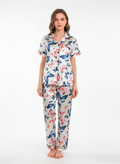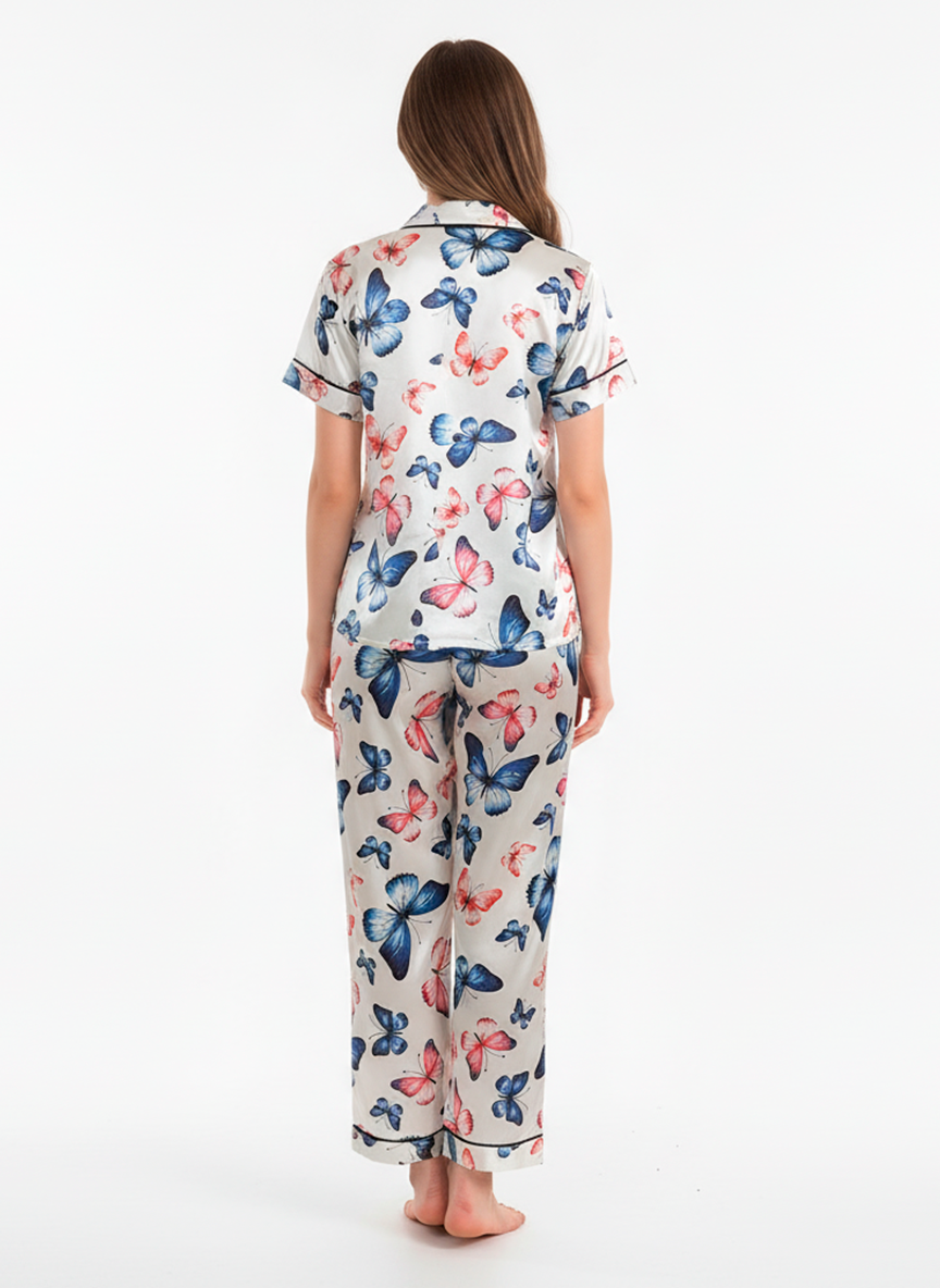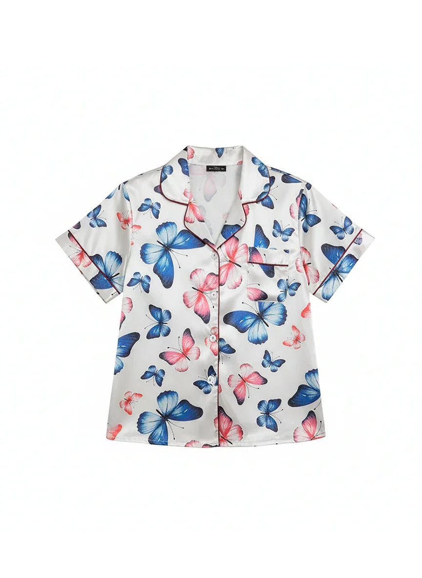 Refresh your nightwear with this floral satin pyjama set from Zzzoria. Crafted from a silky-soft blend of 95% polyester and 5% elastane, it feels smooth against the skin and offers lightweight comfort for summer nights. The short-sleeved button-up top with a neat lapel collar pairs beautifully with full-length trousers, both adorned with a charming floral print. Perfect for lounging, sleeping, or even a cosy pyjama party, this two-piece set combines everyday comfort with feminine elegance.